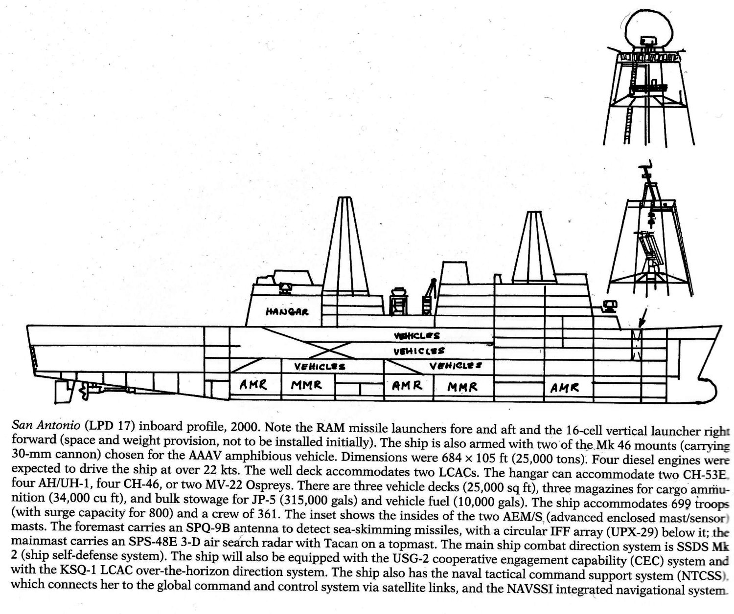 364k | Inboard profile (2000) of San Antonio (LPD-17) Class Amphibious Transport Dock. From "U.S Amphibious Ships and Craft: An Illustrated Design History" by Norman Friedman. |
