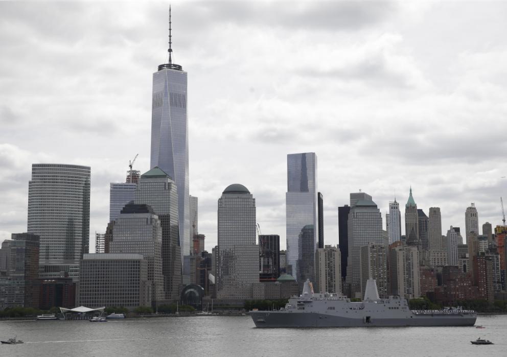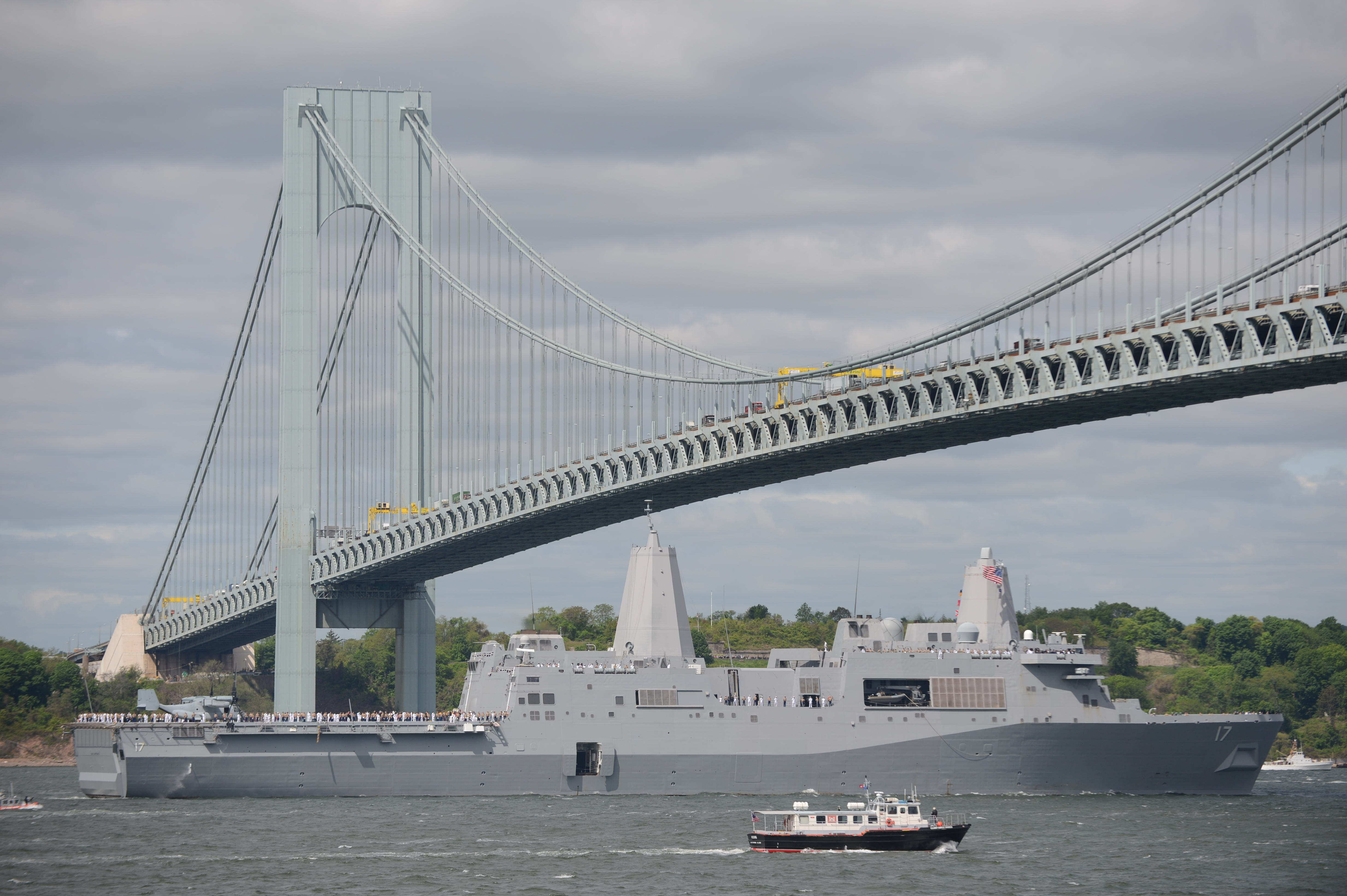 1560k | USS San Antonio (LPD-17) enters New York harbor during the Parade of Ships to start Fleet Week New York 2015.