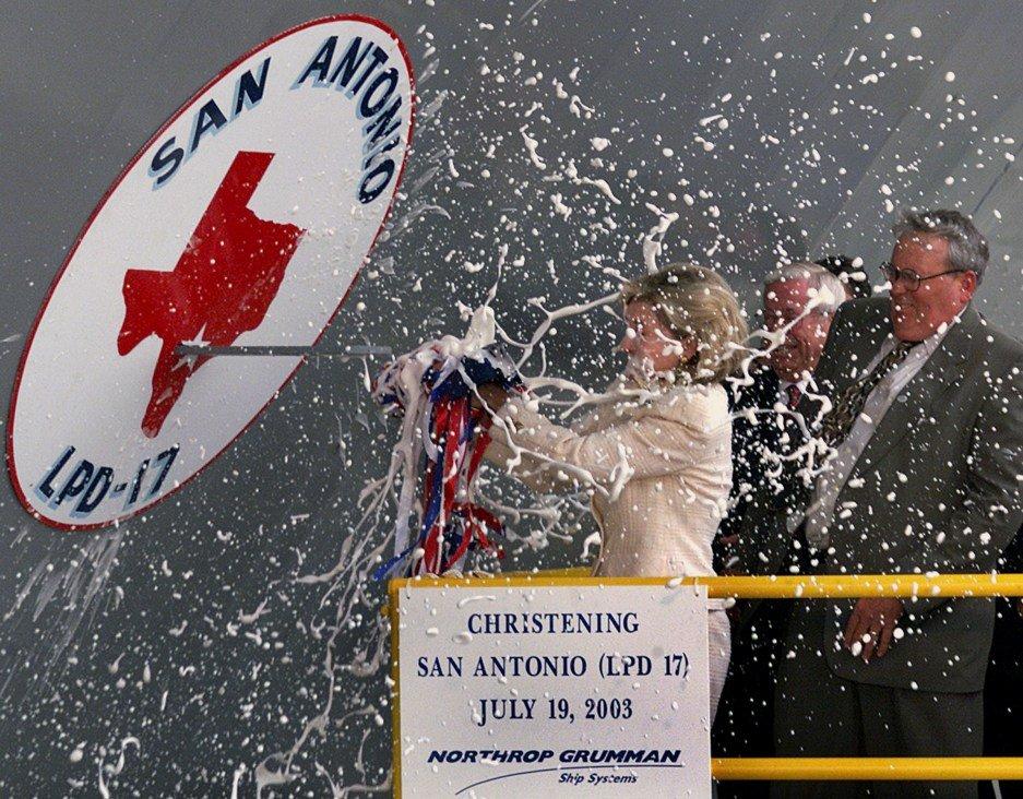 182k | Ship sponsor, Texas Senator Kay Bailey Hutchison, christens San Antonio (LPD-17), 29 July 2003, at Northrop Grumman Ship Systems, Avondale, LA. US Navy photo # 030718-N-3399W-001 |