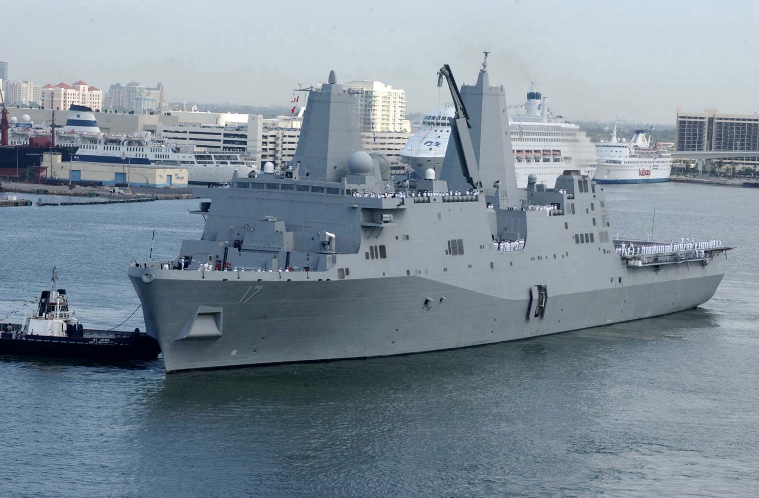 326k | USS San Antonio (LPD-17) arrives at Port Everglades, FL., 1 May 2006, in support of South Florida's Fleet Week USA. Nearly