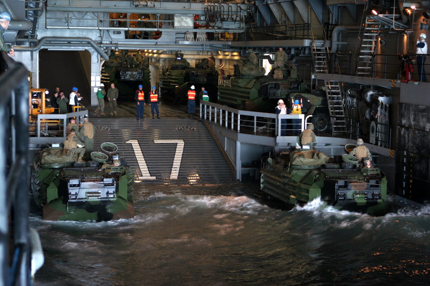 303k | US Marine Corps amphibious assault vehicles wait to be guided onto the vehicle stowage area inside the well deck of