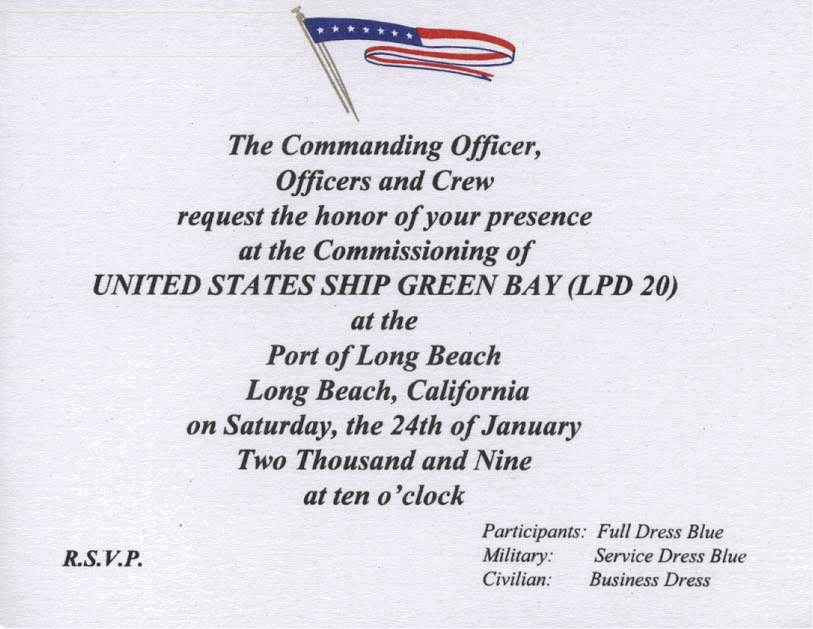 Invitation to the commissioning of USS Green Bay (LPD-20) at Long Beach CA., 24 January 2009. |