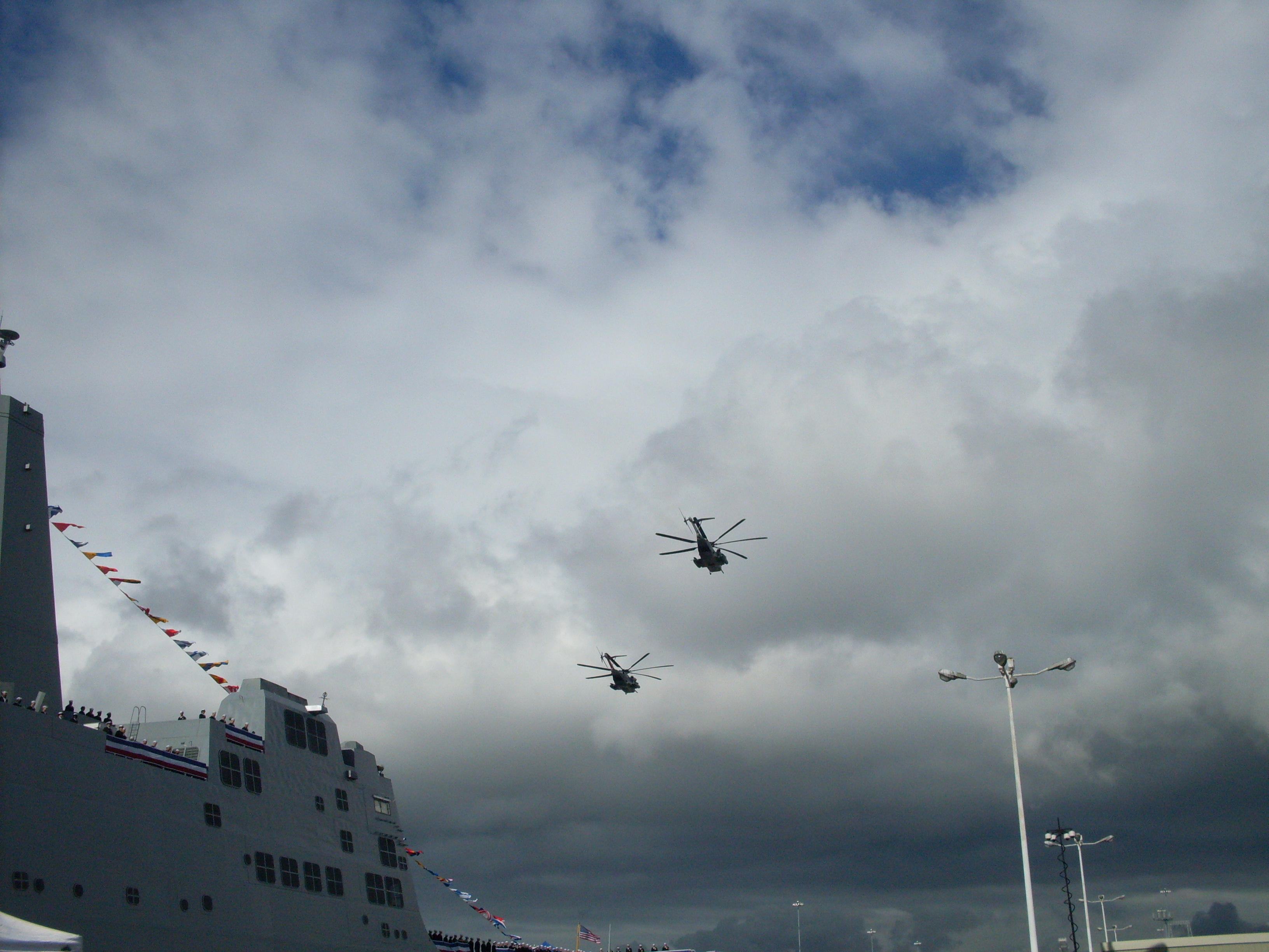 Marine helicopter's over fly USS Green Bay (LPD-20) at the conclusion of the commissioning ceremony, at the ex-Long Beach Naval Shipyard, 24 January 2009. |