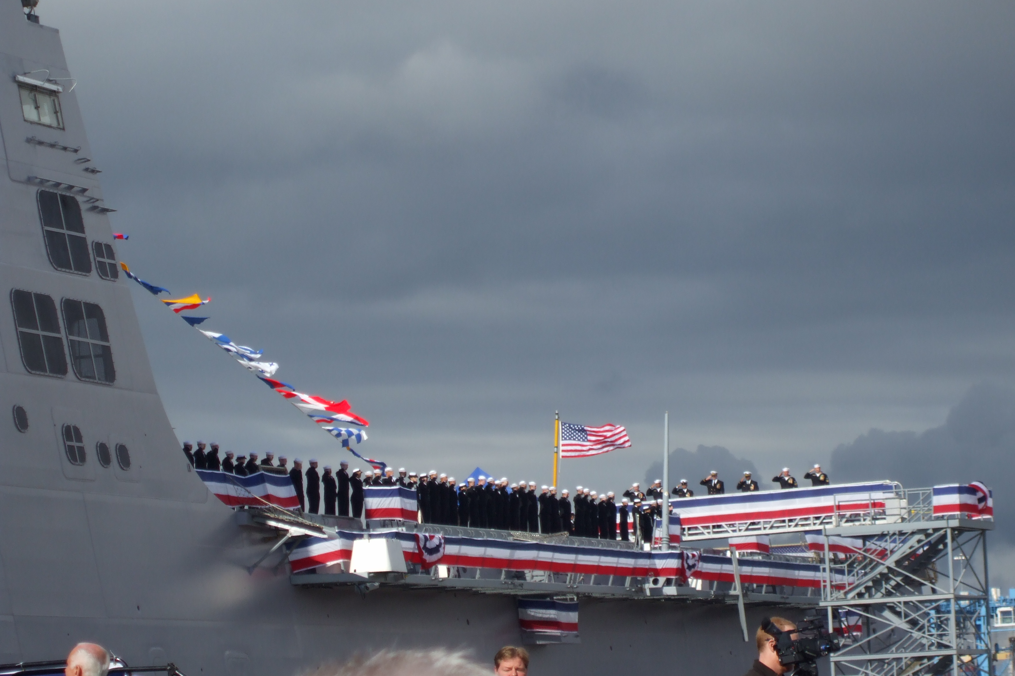 The crew of PCU Green Bay (LPD-20) is mustered for the reading of the orders putting LPD-20 into commission, at the ex-Long Beach Naval Shipyard, 24 January 2009. |