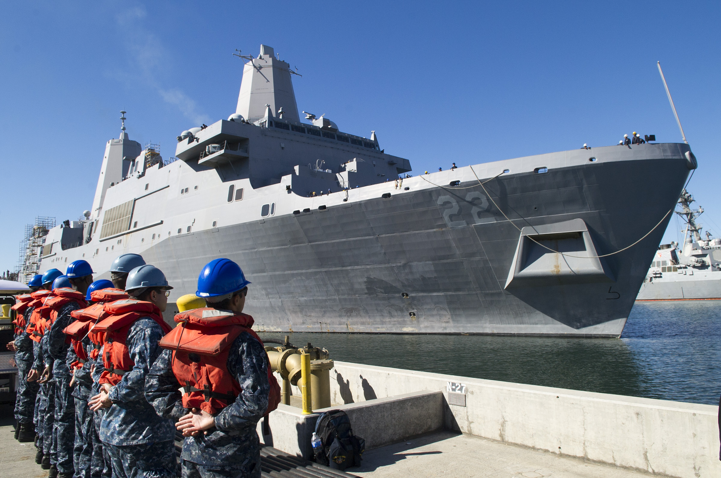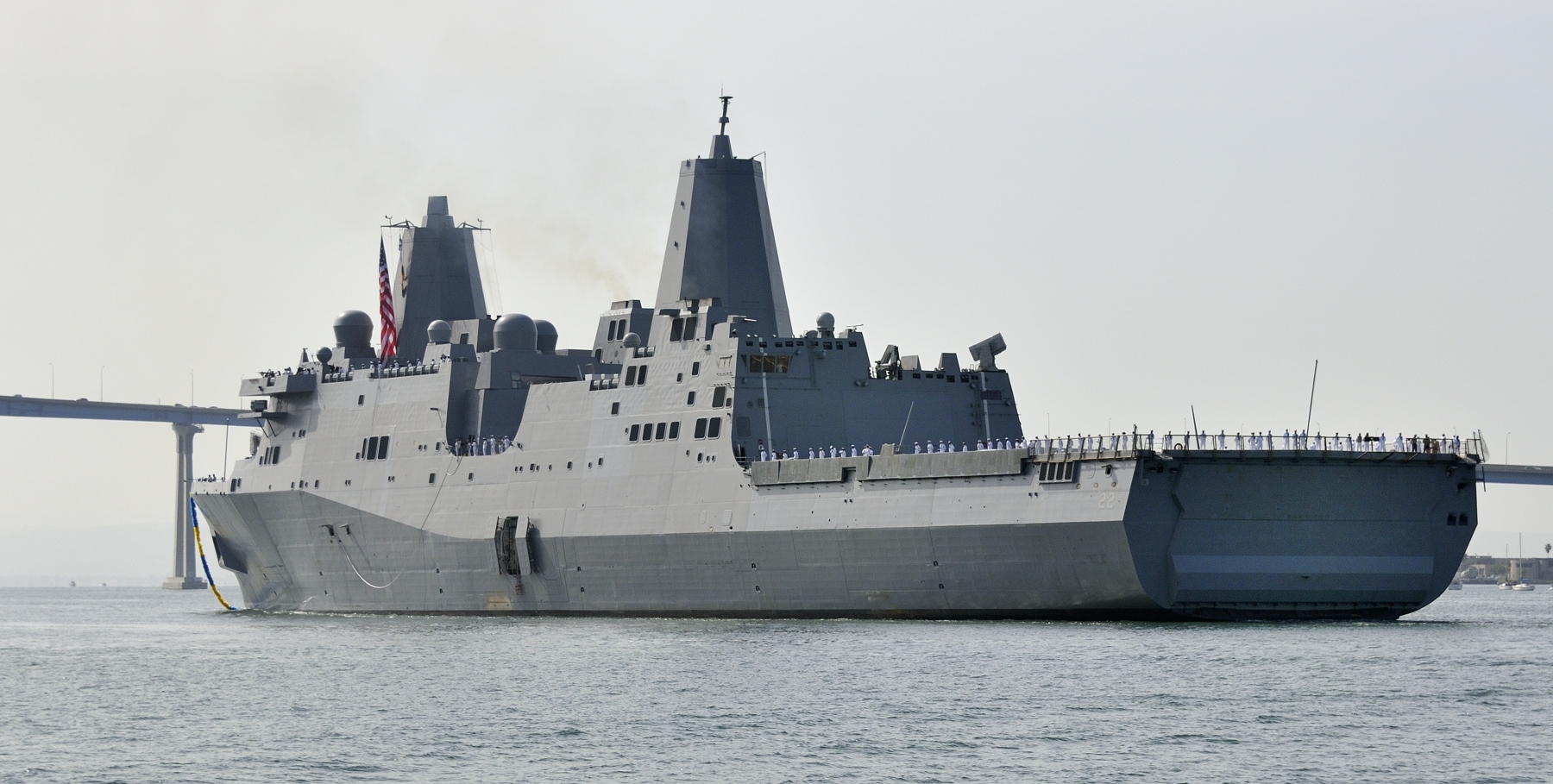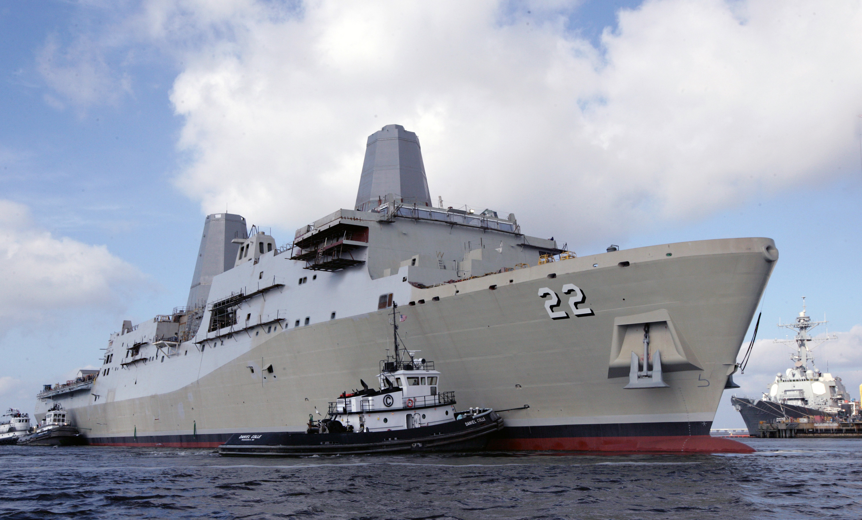 518k | San Diego (LPD-22) successfully completed Navy acceptance trials the week of 18 November 2011, San Diego, the sixth in the LPD 17-class built by Huntington Ingalls Industries Inc.'s Ingalls Shipbuilding division, returned to the yard after a two-day sea trial. Shipbuilders will spend the next month putting the final touches on the vessel before it is delivered in mid-December. Photo courtesy Ingalls Shipbuilding |
