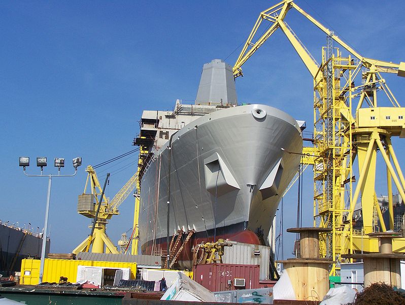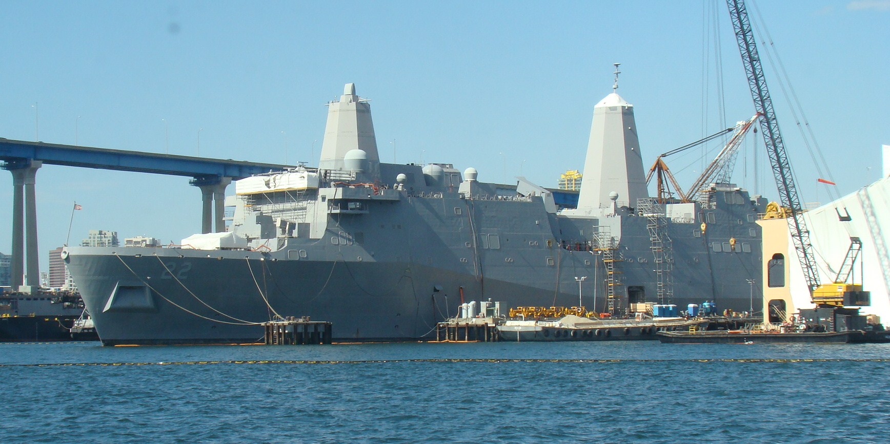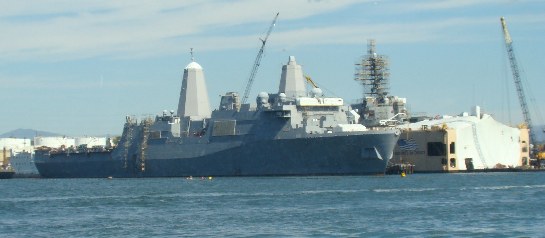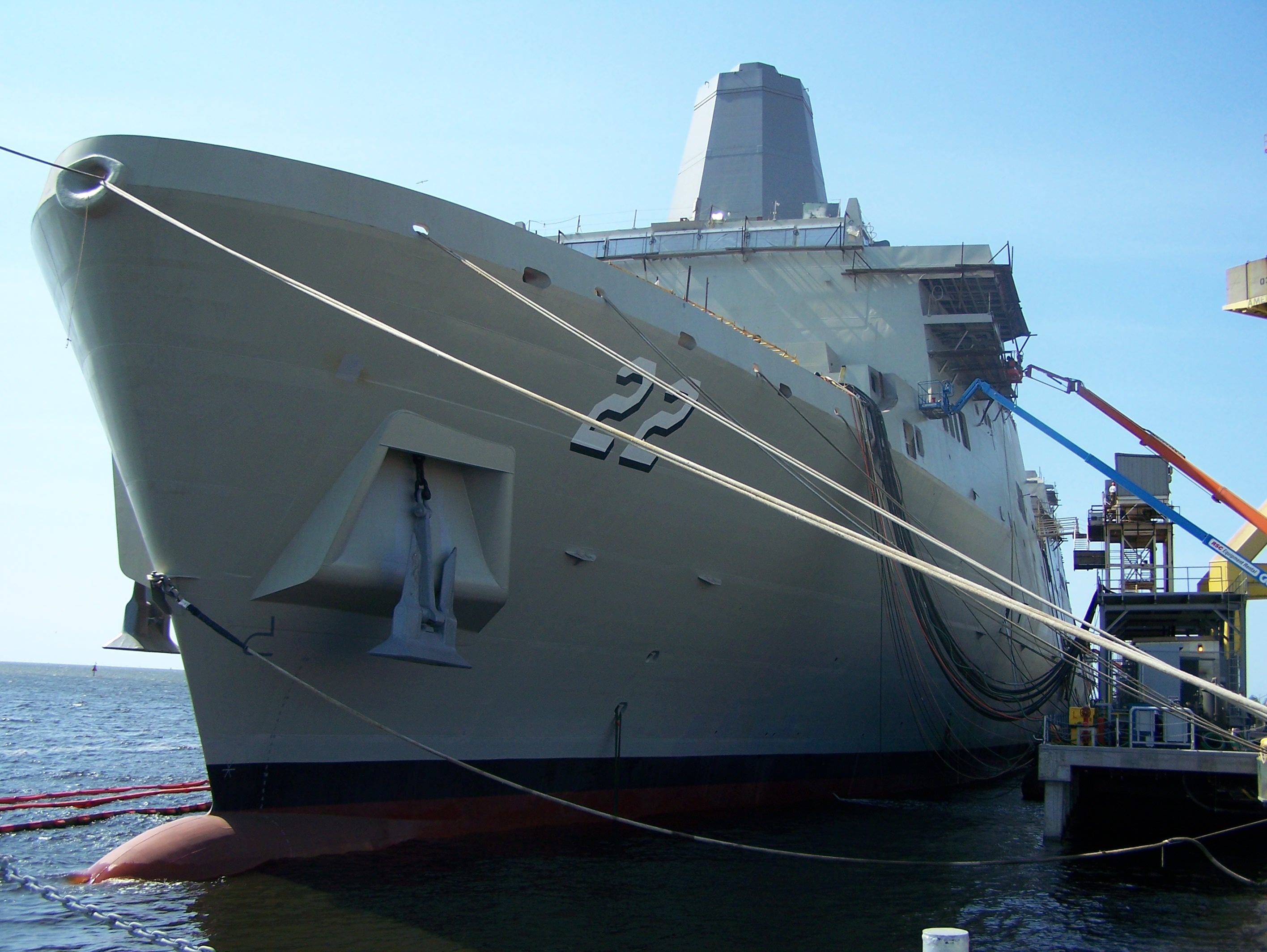 914k | San Diego (LPD-22) moored pierside at Northrop Grumman Shipbuilding Ingalls Shipyard, Pascagoula, MS., 10 May 2010. Photo by Jarienks, copyright released to public domain usage. |