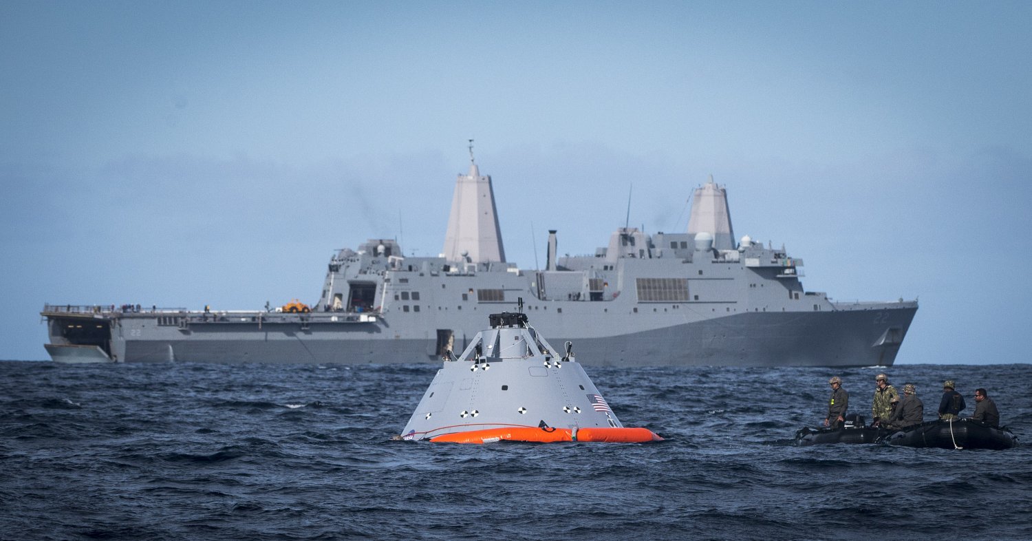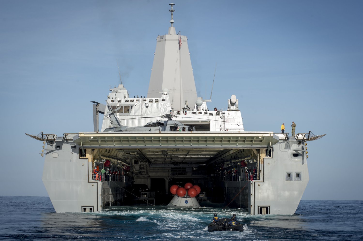 known as the boilerplate-testing article, belonging to NASA's Orion program, to USS San Diego (LPD-22) in the Pacific Ocean. The ship is conducting recovery