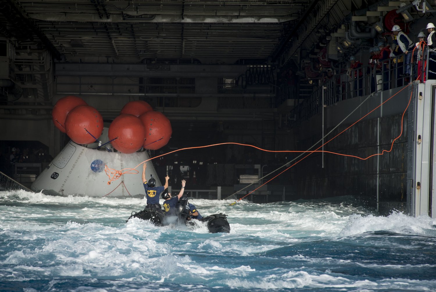 an underway recovery test for NASA's Orion crew module. US Navy Photo # 140220-N-OM642-635 PACIFIC OCEAN (Feb. 20, 2014) by MC1 Gary Keen |