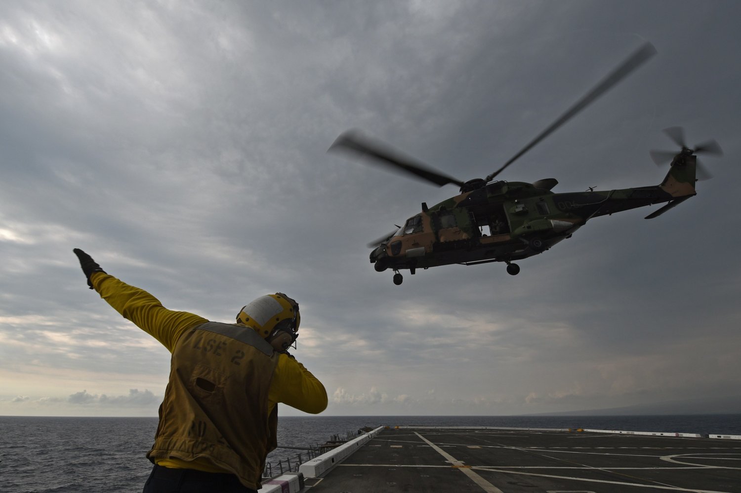121k | Aviation Boatswain’s Mate (handling) Airman Joshua Evans signals a Royal Australian Navy MRH-90 Taipan to enter the pattern above the flight