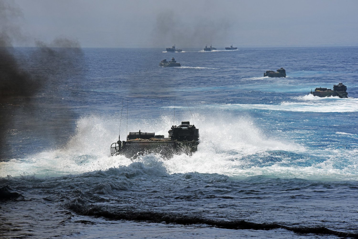 323k | Amphibious assault vehicles depart the well deck of USS San Diego (LPD-22) while Royal Australian Navy landing craft wait