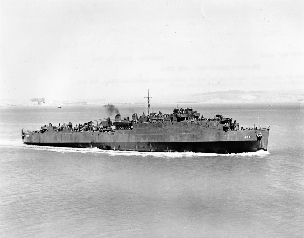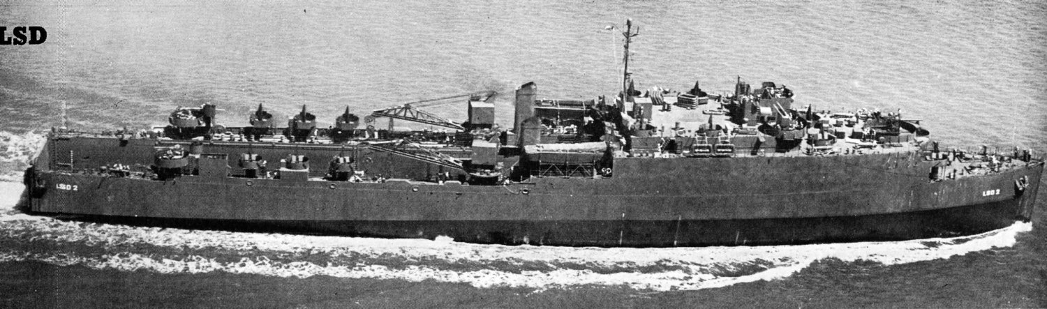 196k | USS Belle Grove (LSD-2) undergoing sea trials in San Francisco Bay, 16 August 1943. US Navy photo from "Allied Landing Craft of World War Two", published by Arms and Armour Press. |