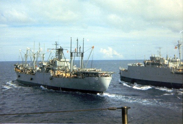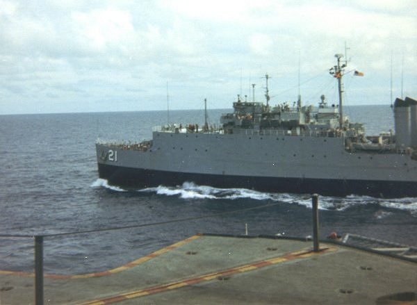 43k | USS Fort Mandan (LSD-21) comes alongside USS Aldebaran (AF-10) as they prepare to commence and UNREP, Caribbean Sea, circa 1967. This photo was taken by Bruce Johnson from an unidentified LPH, possibly USS Guadalcanal (LPH-7). | Pete Harlem, Courtesy Bruce Johnson USMC HMM-261 | |