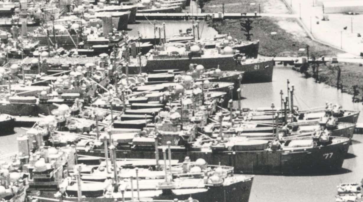 175k | Aerial view of the Atlantic Reserve Fleet at Orange, Tx., Texas in 1948, Indian Island (AG-77) and Fort Mandan (LSD-21) are distinguishable, date unknown. | Dave Schroeder and John Chiquoine | |