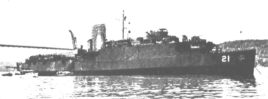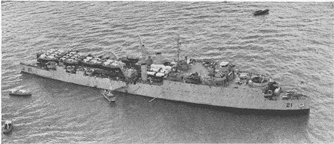 84k | USS Fort Mandan (LSD-21) lies at anchor with her stern gate open waiting for her "brood" to return. Note the cranes and grating over the well deck which houses some 12 small boats, date and location unknown. US Navy photo from "All Hands" magazine May 1947 issue |