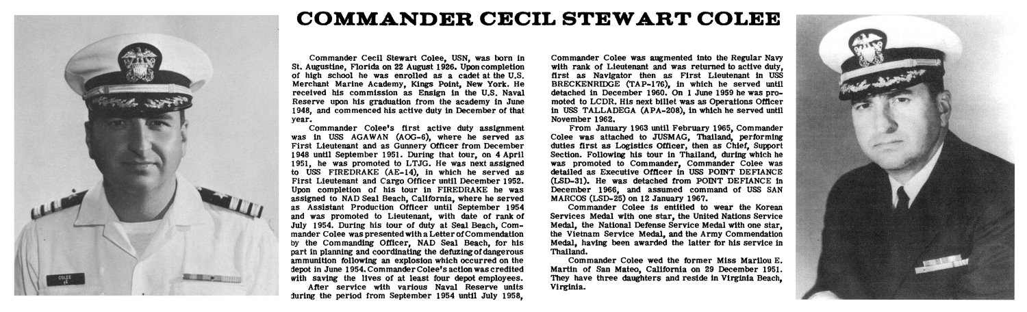 | 16 | CDR. Colee, Cecil Stewart, USN (USMMA 1948) | 12 January 1967 - October 1968 |