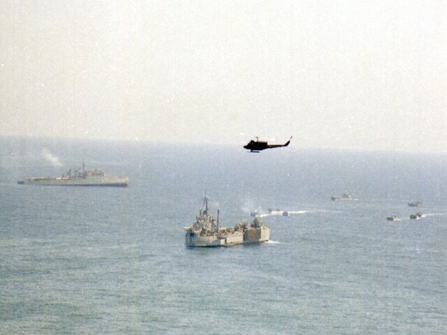 48k | On May 30, 1981 ("Dia de las Fuerzas Armadas", Armed Forces Day) the Spanish Navy performed a simulated amphibious assault for the citizens of Barcelona. This view shows the Tank Landing SPS Velasco (L 11), center and the Dock Landing Ship SPS Galicia (L 31), left background --ex-USS Terrebonne Parish (LST 1156) and ex-USS San Marcos (LSD 25), respectively--; landing craft are headed to the beach and a support helicopter overflies the ships. | Photo by Fabio Peņa | |
