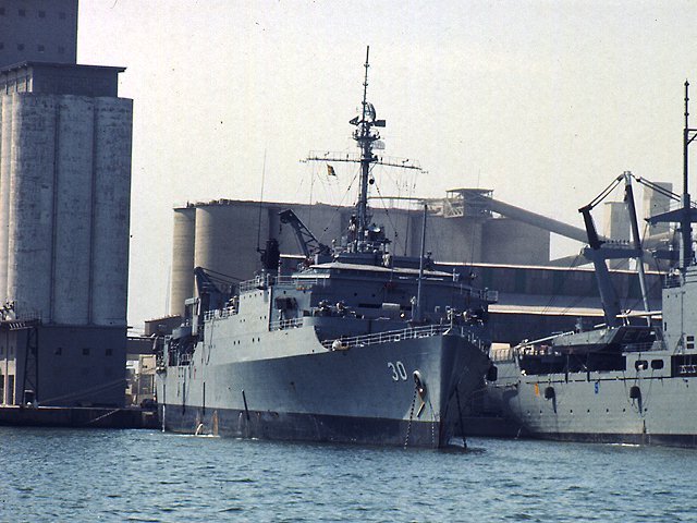 108k | USS Fort Snelling (LSD-30) at Barcelona, Spain, 6 April 1977, USS El Paso (LKA-117 is just visible inboard of Fort Snelling. | Photo by Fabio Peņa | |