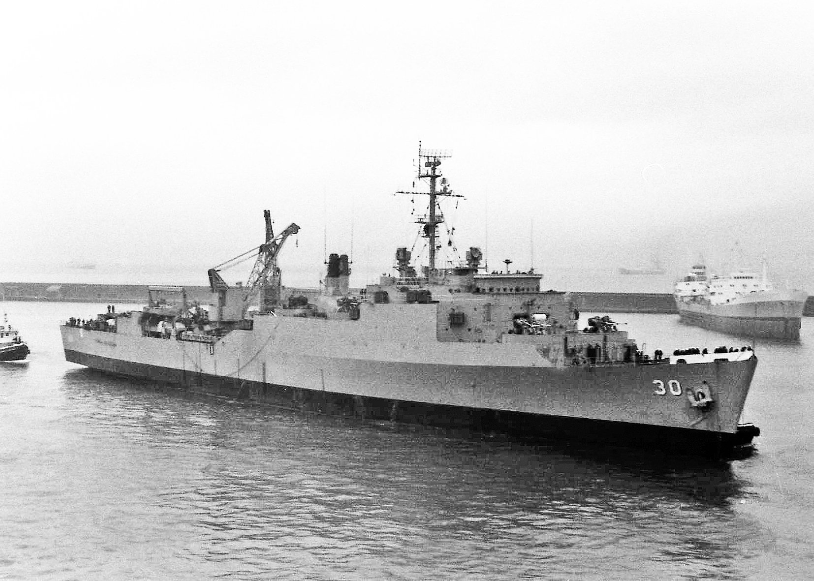 78k | USS Fort Snelling (LSD-30) at Barcelona, Spain, 6 April 1977. Note the SPS-6 air search radar antenna on the mast. Thomaston-class LSDs were the last active ships fitted with this radar set. USS El Paso (LKA-117) is alongside. | Photo by Fabio Peņa | |