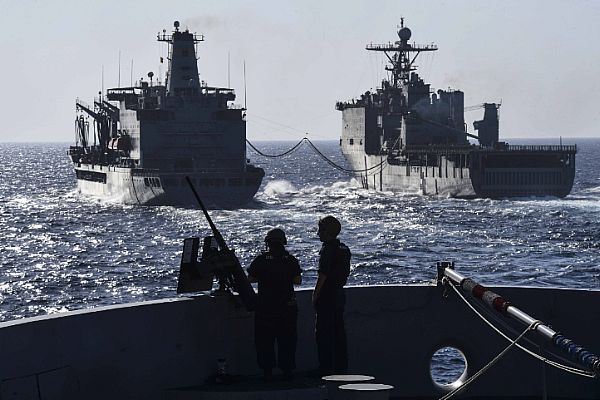 USS San Diego (LPD-22) as she approaches the fleet replenishment oiler USNS