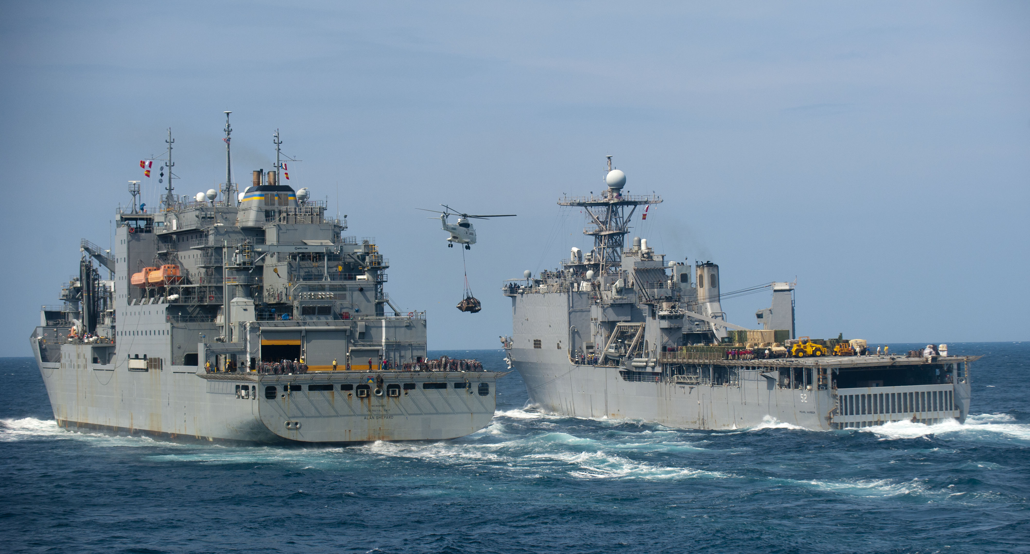 1067k | A helicopter from USNS Alan Shepard (T-AKE-3) delivers supplies to USS Pearl Harbor (LSD-52) during a vertical replenishment. Pearl Harbor is operating in the U.S. 7th Fleet area of responsibility as part of the Makin Island Amphibious Ready Group. US Navy photo # 111210-N-PB383-953 PHILIPPINE SEA (Dec. 10, 2011) by MC2 Dominique Pineiro. |