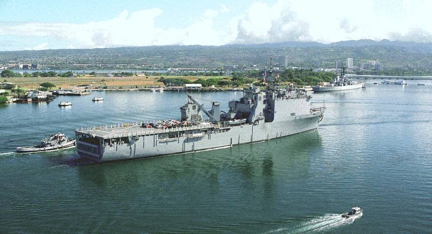 79k | USS Pearl Harbor (LSD-52) entering Pearl Harbor Naval Station. USS Missouri (BB-63) and USS Arizona (BB-39) Memorial ahead and to port of USS Pearl Harbor. US Navy photo |