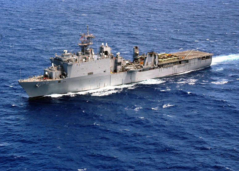 323k | A Landing Craft Utility (LCU), carrying a reverse osmosis water system, enters the well deck of USS Pearl Harbor (LSD-52) during Pacific Partnership 2013. Pearl Harbor will deliver the reverse osmosis water system to Ebeye, an atoll of the Marshall Islands, to assist in water filtration. US Navy photo # 130706-N-SP369-053 MAJURO, Marshall Islands (July 6, 2013) by MC3 Samantha J. Webb. |