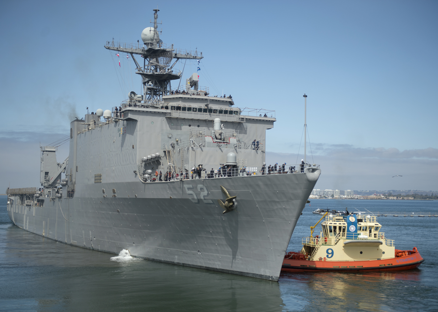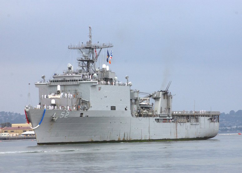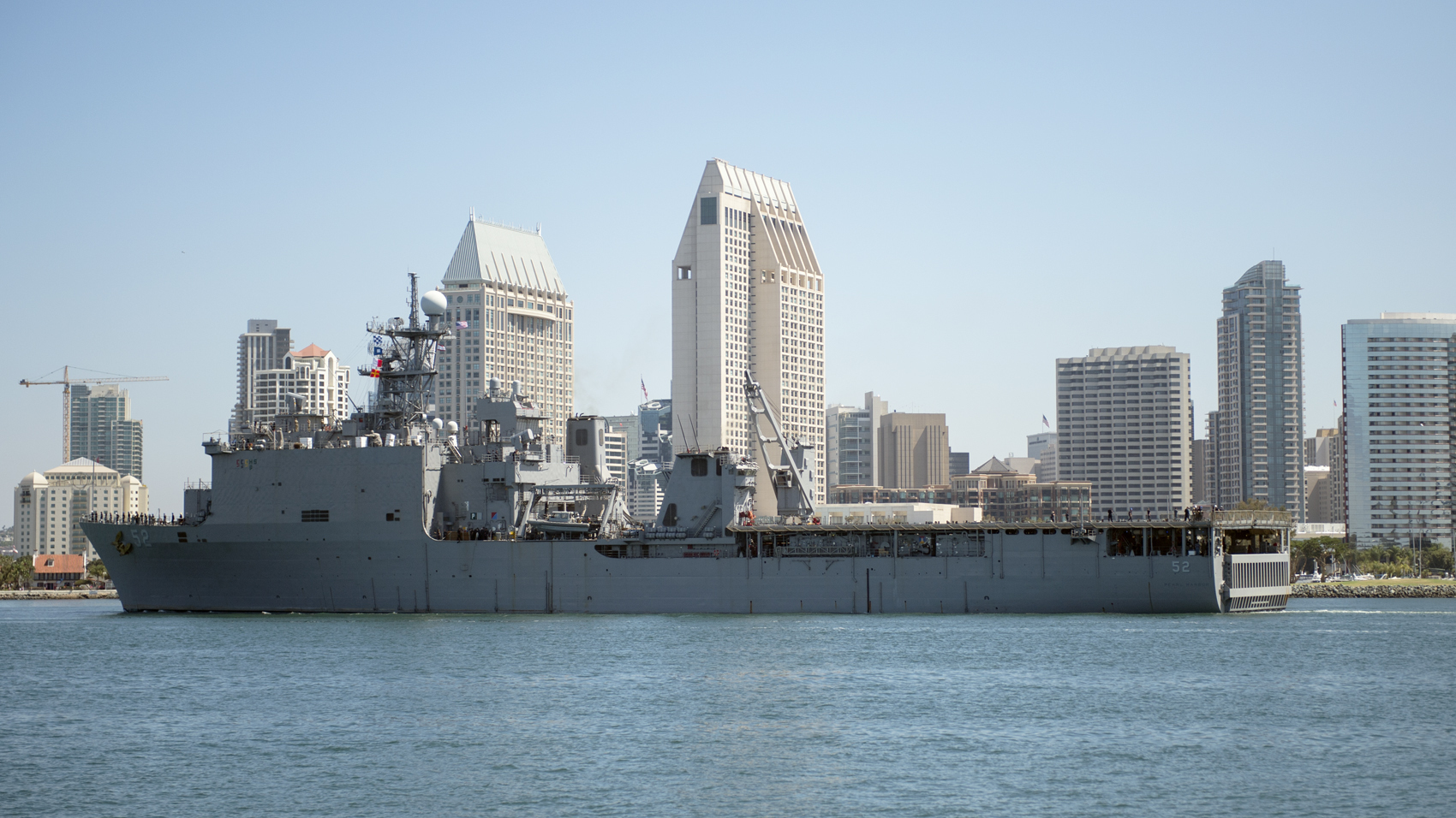 59k | USS Pearl Harbor (LSD-52) pulls into San Diego Harbor on her way to her berth at Naval Station San Diego with her Sailors "manning the rails.", 26 July 2003. USS Pearl Harbor is part of the seven-ship Amphibious Task Force West (ATF-W), returning home after supporting U.S. and coalition forces during Operation Iraqi Freedom US Navy photo # 030726-N-0226M-009 by PHCS Mahlon K. Miller. |