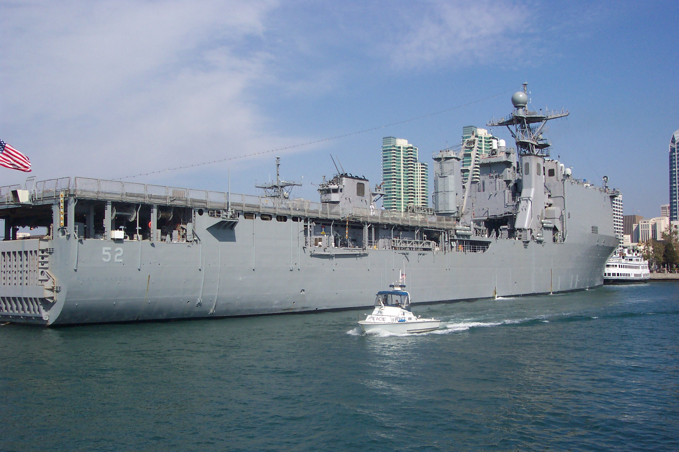 117k | A close-up view of USS Pearl Harbor (LSD-52) as she arrives at Naval Station San Diego, 26 September 2007.