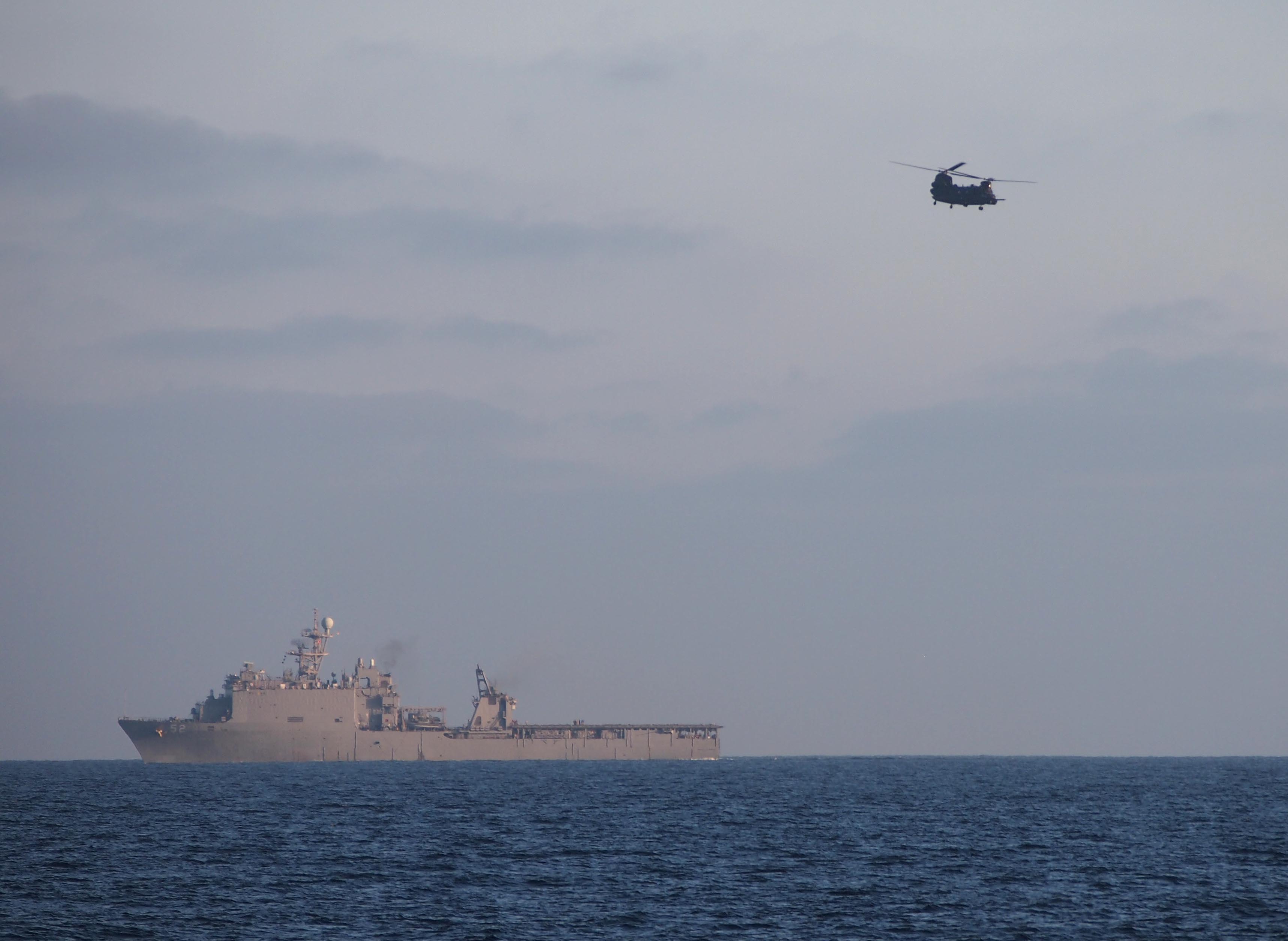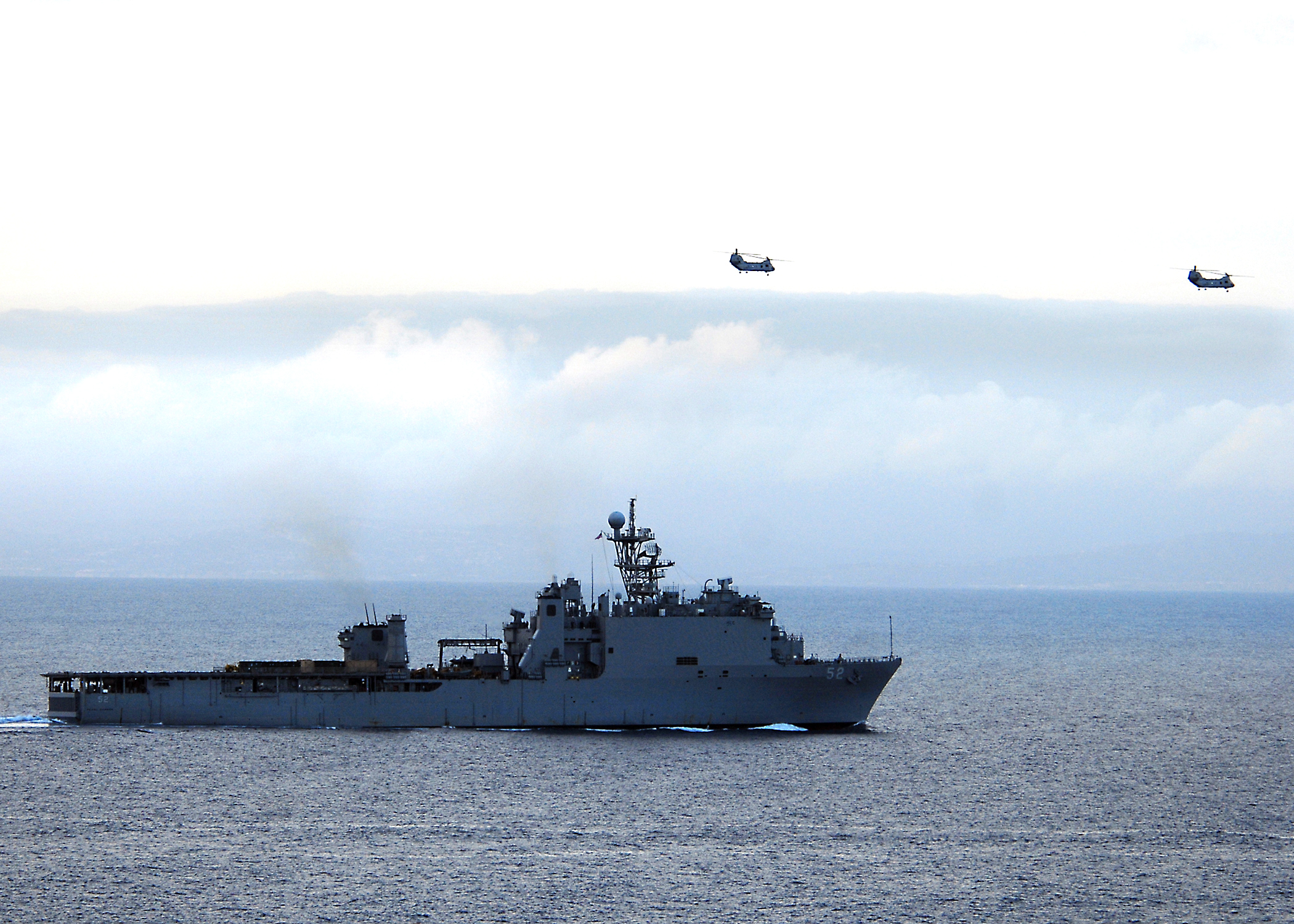 2000k | Two CH-46 Sea Knight helicopters from the amphibious assault ship USS Peleliu (LHA-5) fly over USS Pearl Harbor (LSD-52) off the coast of Southern California. Both ships are conducting composite training unit exercise. US Navy photo # 100330-N-7948R-199 PACIFIC OCEAN (March 28, 2010) by MC2 Michael Russell. |