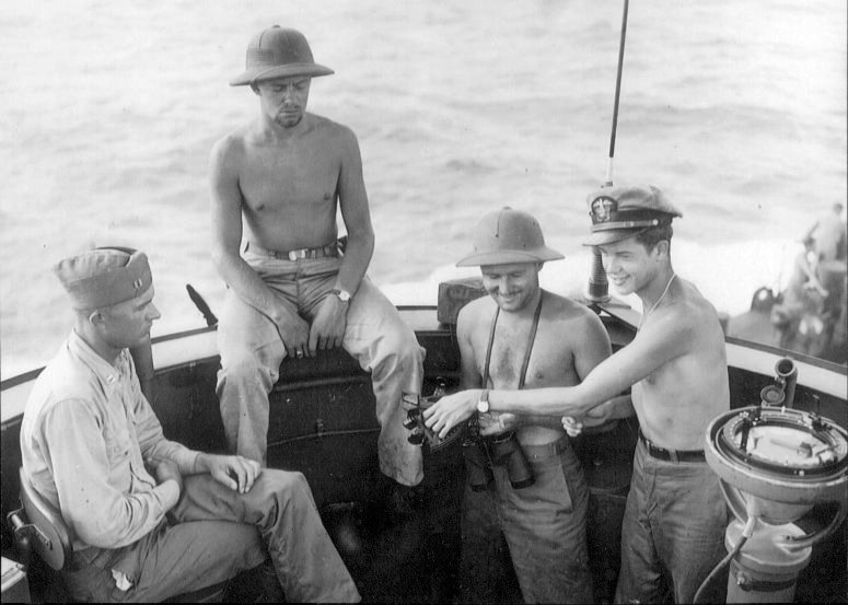 69k | USS LSM-9 enroute to Guam, late October-1944. Four of the five ship's officers on the conn, Left to right, LT. Rob Olson, Ens. Bob Sinclair, Ens. Van Fox, and Ens. Ray Biswanger. Not shown, Ens. Henry Badgett. | Raymond A. Biswanger, Jr., Ph.D., LT. USN Ret. USS LSM-9 | ||
