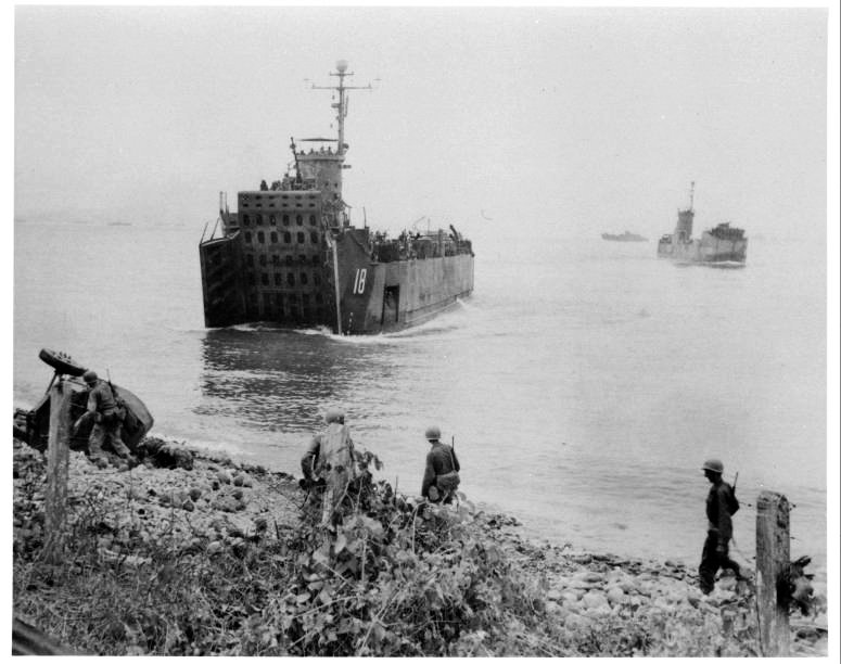 136k | USS LSM-18 and USS LSM-138 unloading over the beach at Zamboanga, Mindanao, 1 April 1945. US National Archives Photo # 80-G-359833, a US Navy photo now in the collections of the US National Archives. Courtesy Ken Roberts. |