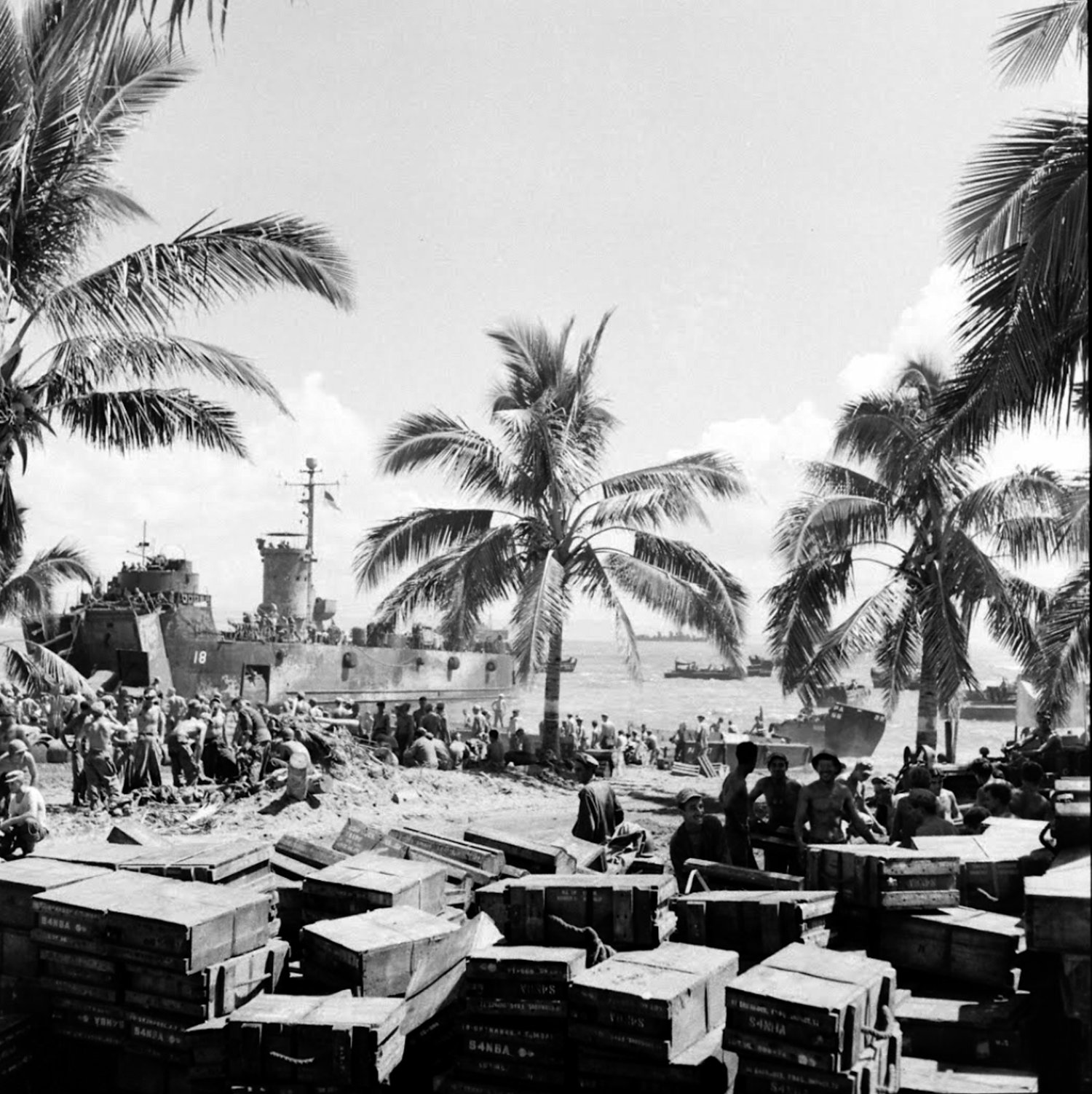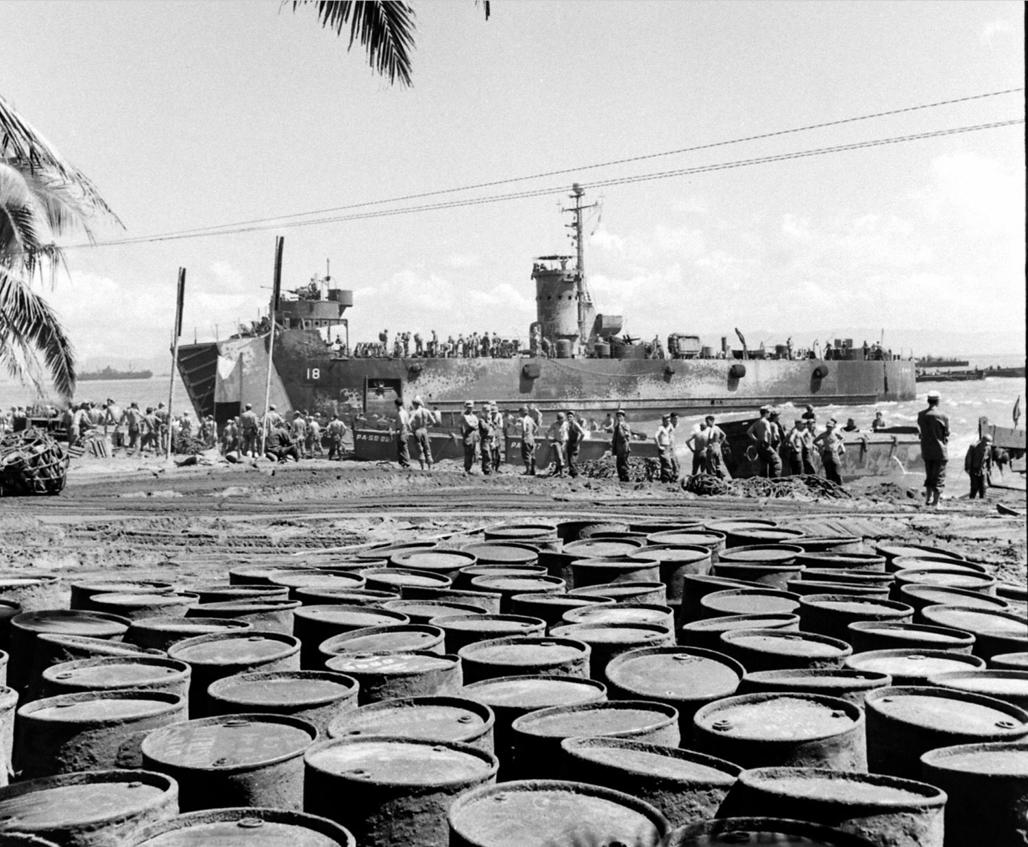 372k | US Army stevedores unload supplies from USS LSM-18 beached at Leyte, December 1944