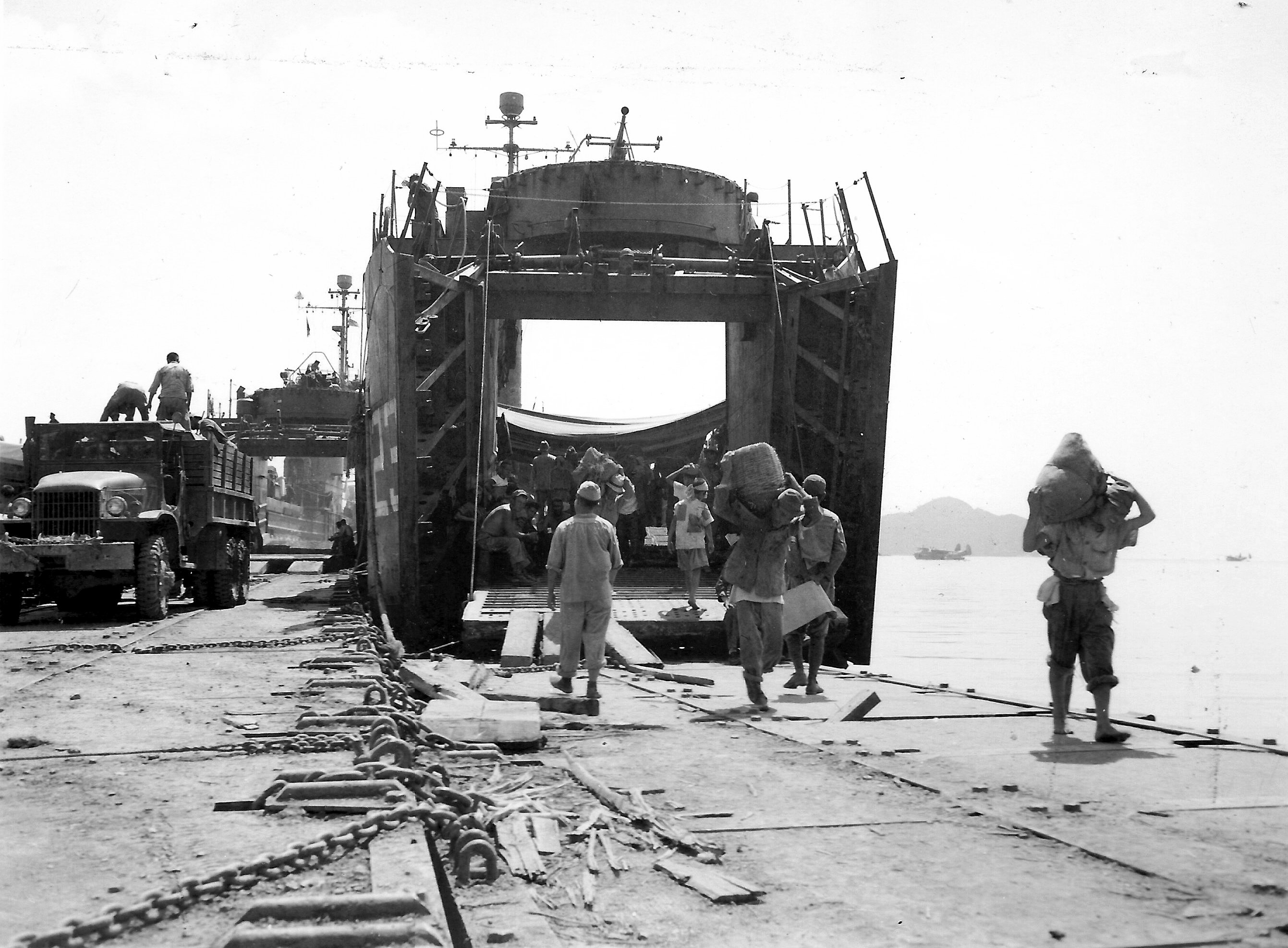 762k | Japanese Prisoners of War unload USS LSM-23, probably at Kerama Retto in May 1945. Photo by PhoM 2/C Paul D. Guttman. | Robert Guttman for his father PhoM 2/C Paul D. Guttman | |