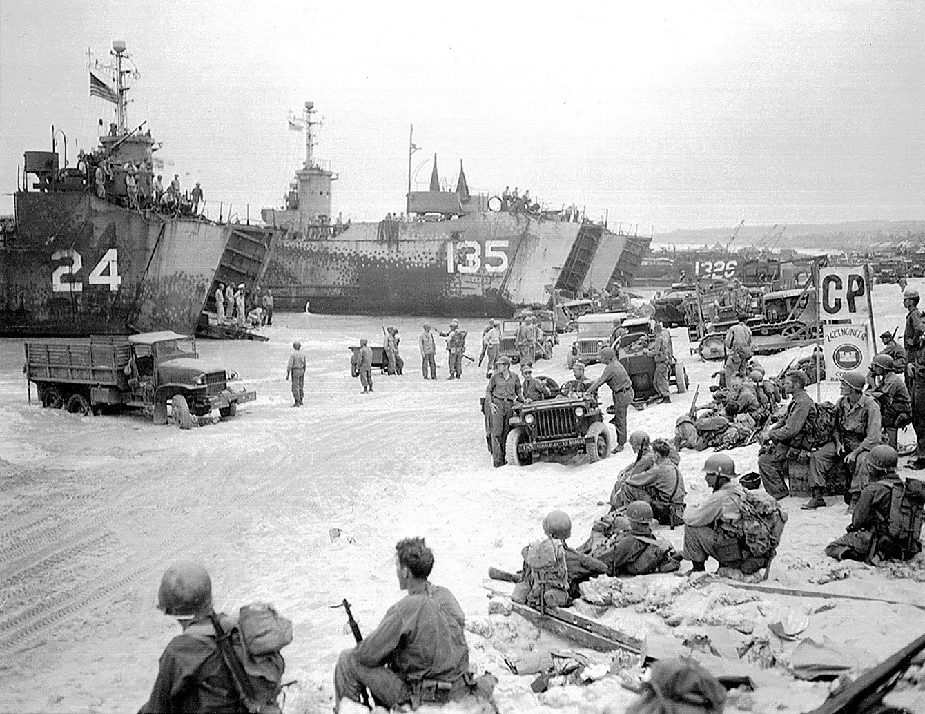 LCT-1326 and other landing craft unloading cargo on Ie Shima, Ryukyu Islands, 24 April 1945.