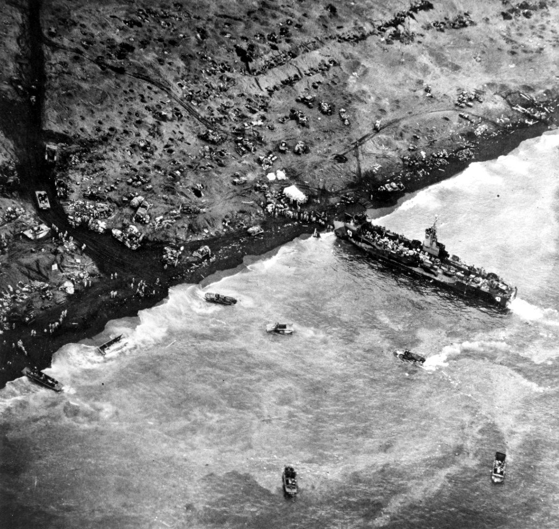 Note LVT and DUKW amphibious vehicles at work on and off shore, and the cluttered condition of the beach. Taken by an Edward Steichen Unit photographer. US National Archives, Photo # 80-G-412499, a US Navy photo now in the collections of the US National Archives. |