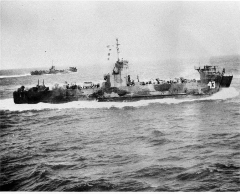USS LSM-43. LCTs include LCT-892 and LCT-1029. The one lone LCI that is identifiable is LCI(L)-1077. USMC photo # 110582 |