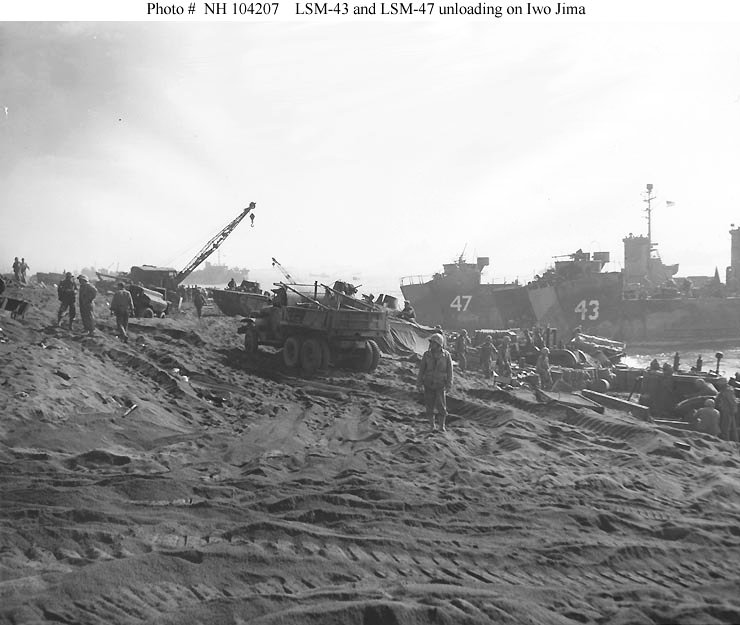 331k | USS LSM-43 lands supplies on the Iwo Jima shore as U.S. forces build up their strength on the island, circa late February 1945.
