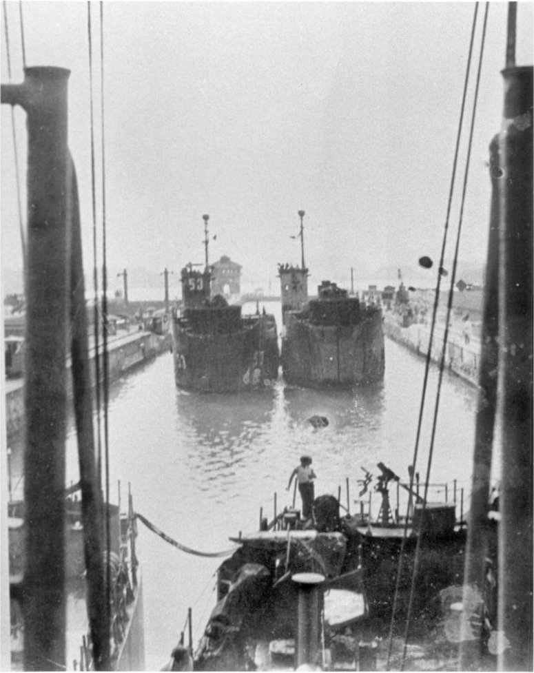 127k | USS LSM-53 together with an unidentified LSM in the locks in the Panama Canal, date unknown. | Bob Magnuson to the USS LSM / LSMR Association | |