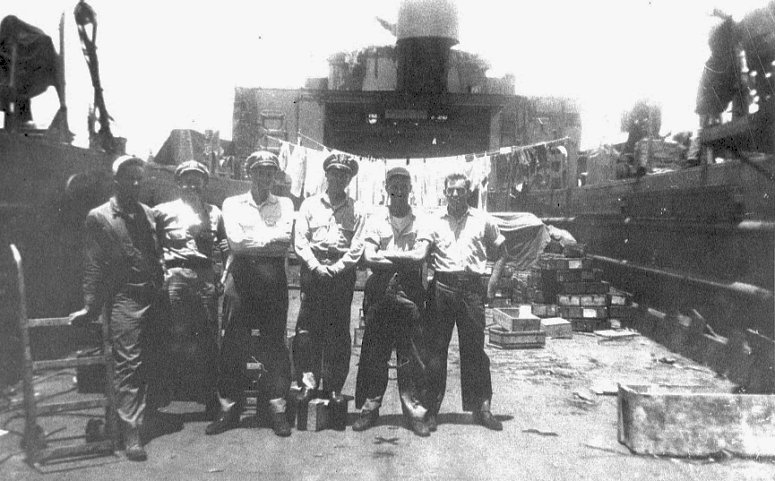 USS LSM-59 officers, Left to Right, Unknown, Lt.(jg) J.D. Wyker, Ensign C.S. Bramley, CO Lieut. D.C. Hawley, Ensign E.H. Rogers Jr., Ensign C.E. Cason |