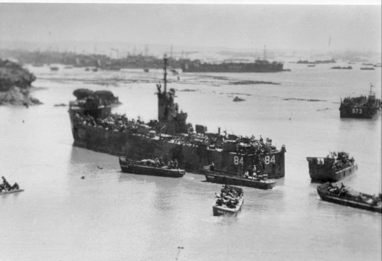 66k | USS LSM-84 unloading an armored tracked vehicle on the beach at Okinawa alongside USS LST-71and an unidentified LST, date unknown. | USS LSM / LSMR Association | |