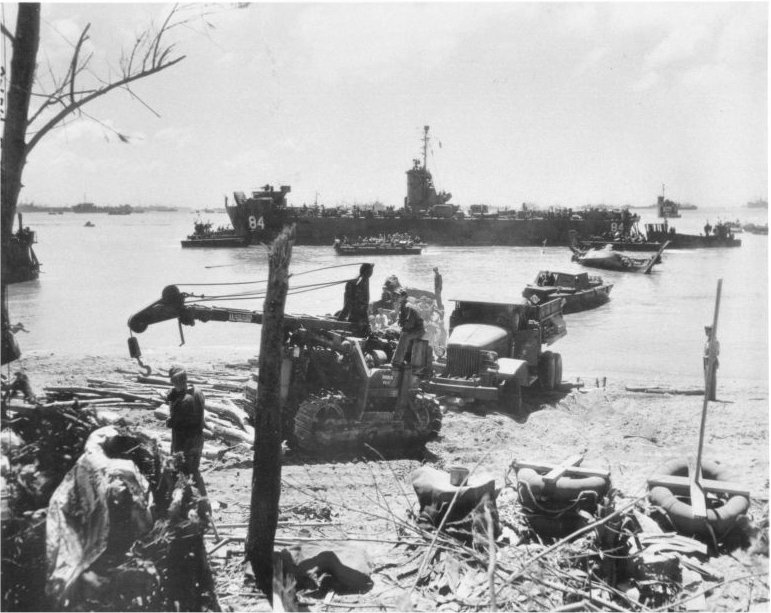 9560k | LCT's unloading at Yellow Beach, Okinawa, 13 April 1945. From left to right;