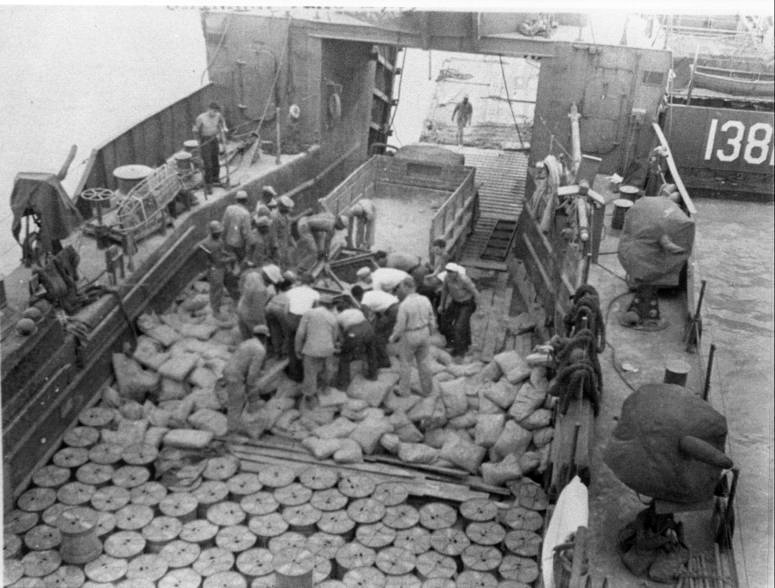 LCT-1415, LCT-1175, LCT-1265 and LCT-1049. With USS LSM-220, USS LST-1000 and LCT-418 standing off the beach and in the middle distance in the center USS LSM-84 and USS SC-1281 are just visible. US National Archives Identifier 205586456 Local ID 26-G-4426, US Coast Guard photo # 4426. |