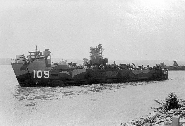 73k | USS LSM-109 anchored at Keokuk, Iowa on the Mississippi River during October 1945. Only partially visible are USS LSM-108 and USS LSM-113. Note: masts and yardarms had been removed for river travel. | Joe Gerencser to the USS LSM / LSMR Association | |