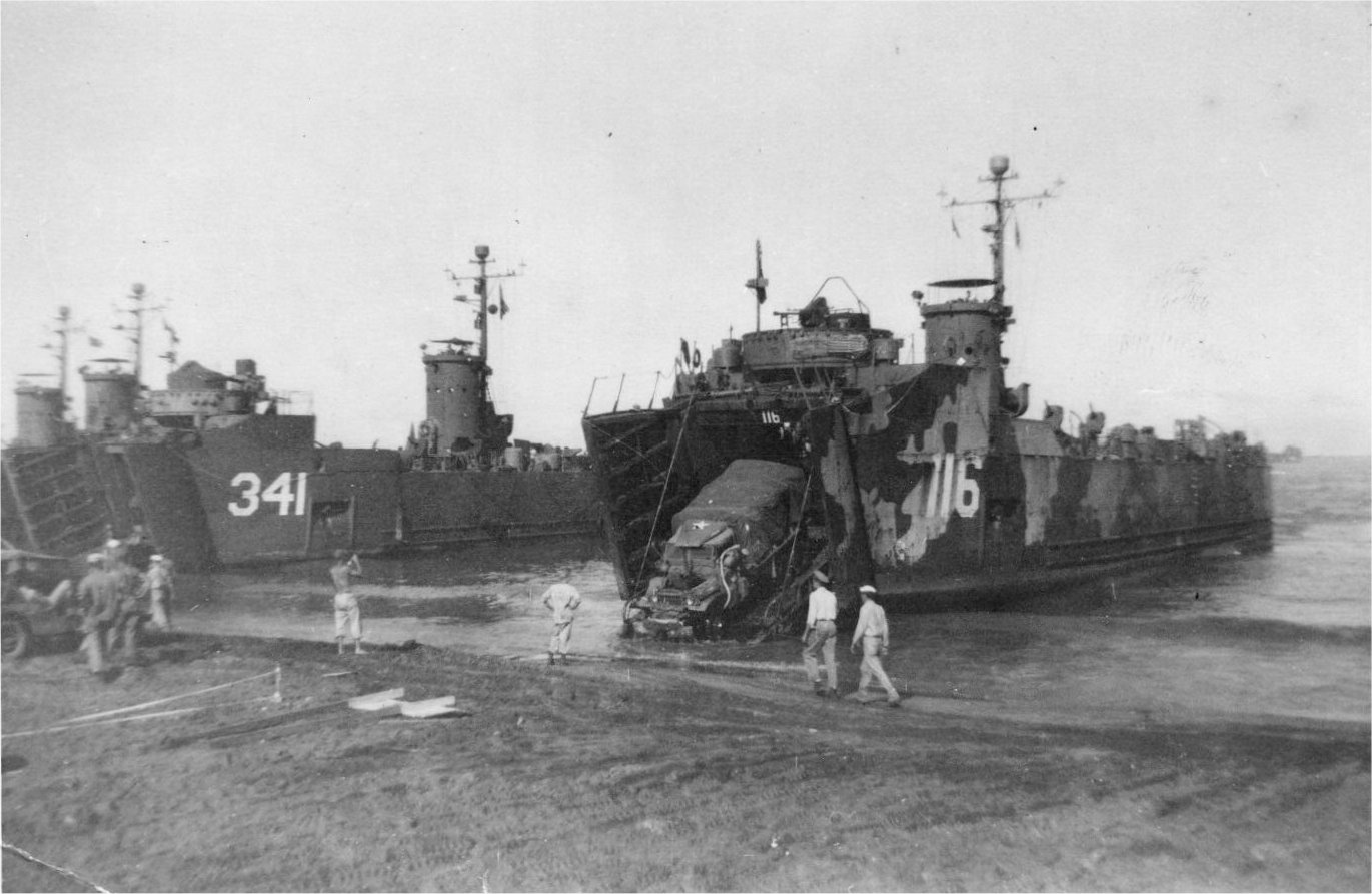 171k | USS LSM-341, beached probably in the Philippines in 1945 as USS LSM-116 loads a truck while preparing to depart for Okinawa. | The Harold Vorst Family, Rose, Dennis, Marge, Karen, Mary Lou, Dave, Linda, Therese, and Duane | |