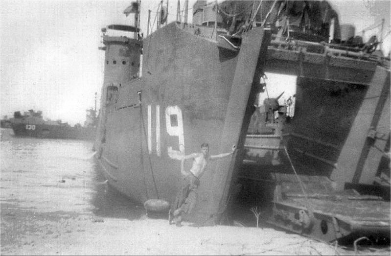 79k | USS LSM-119 beached, date and location unknown. Note USS LSM-130 in the background. | USS LSM / LSMR Association | |