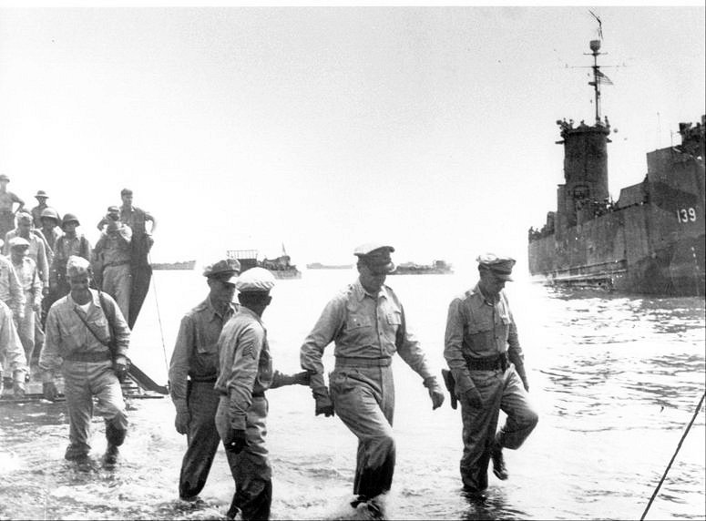 76k | USS LSM-139 seen here in the right background as General Douglas MacArthur wades ashore at White Beach during the Leyte landings, 20 October 1944, during the Philippines Liberation. This photo was published in Life magazine's November, 13, 1944 issue, courtesy of Perry T. Egger who was on the bridge of USS LSM-139 at the time and who was given copy of the photo by Life. | Photo Courtesy Jim Tusing USS LSM-372, Editor "Alligator Alley" The Newsletter of the USS LSM - LSMR Association | |