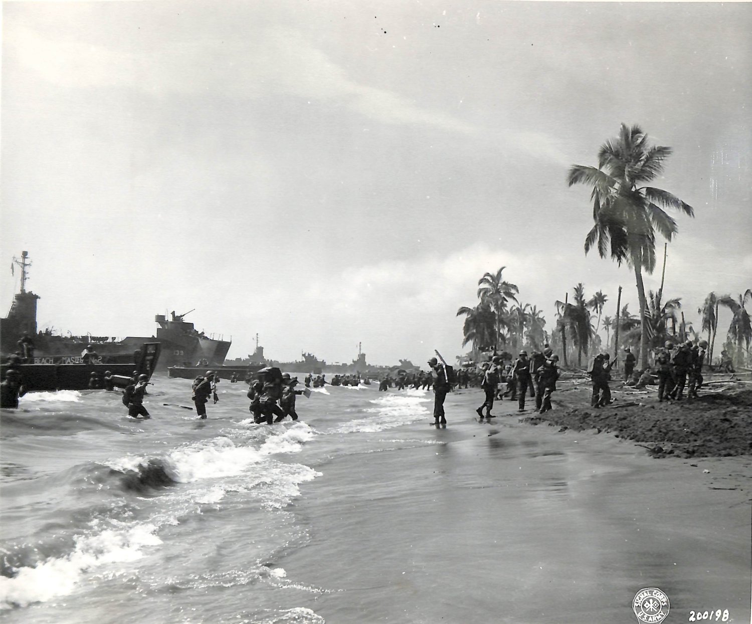 101413903 | 255k | USS LSM-139 landing US Army personnel ashore at Leyte, Philippine Islands, 20 October 1944.
