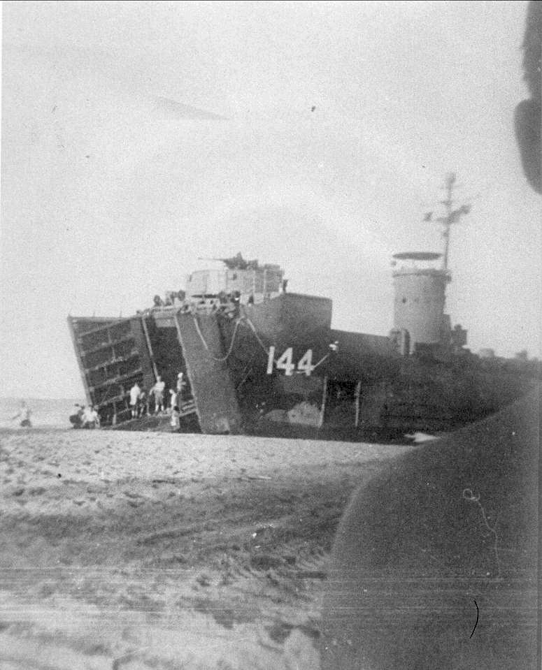 122k | USS LSM-144 beached, date and location unknown. | Ted Turner USS LSM-144 and John Bochles to the USS LSM / LSMR Association | |