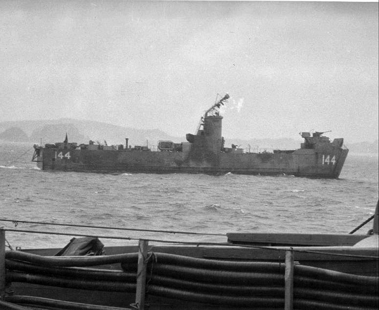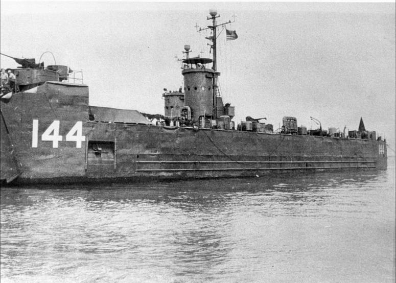77k | USS LSM-144 underway, at Lingayen Gulf, date unknown. Note the damaged mainmast the result of an encounter with a boat boom of the USS Pennsylvania (BB-38). | USS LSM / LSMR Association | |