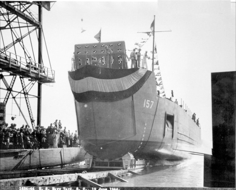 81k | LSM-157 launching, 19 June 1944 at US Navy Yard, Charleston, S.C. US Navy photo. |